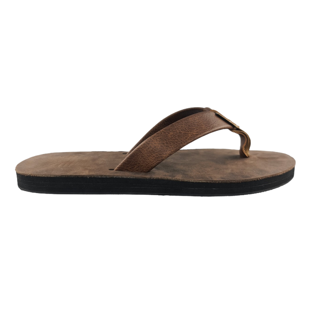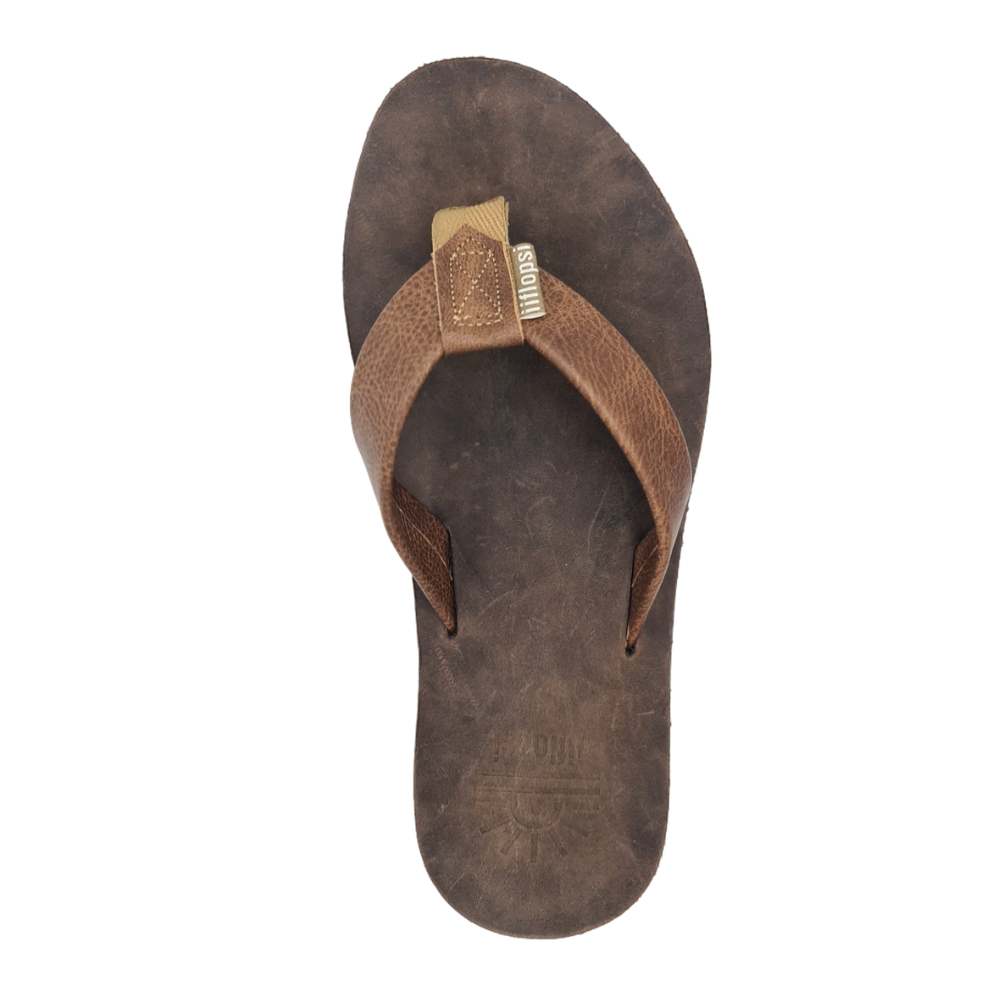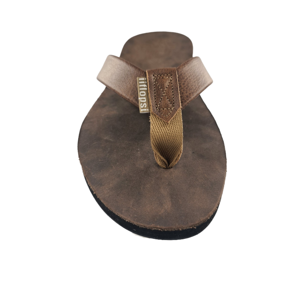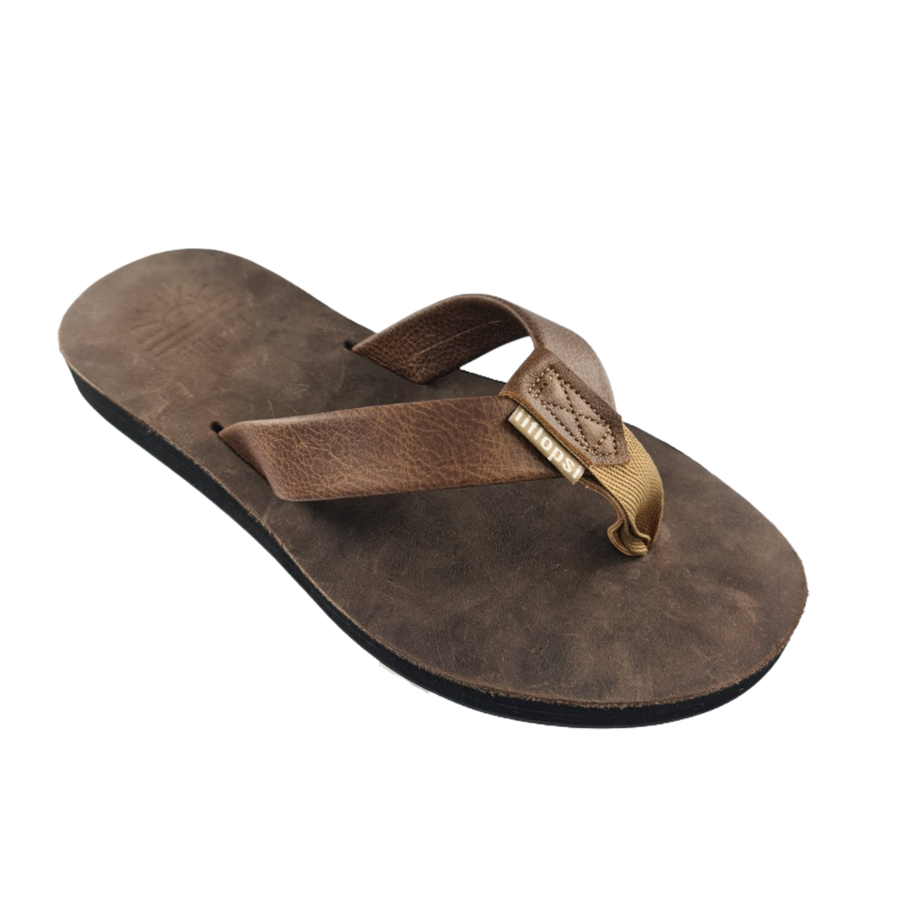 Full grain Walnut leather Upper and strap with black inlay. For someone looking for a bit more comfort, this leather is very soft. It does not come with an arch support.