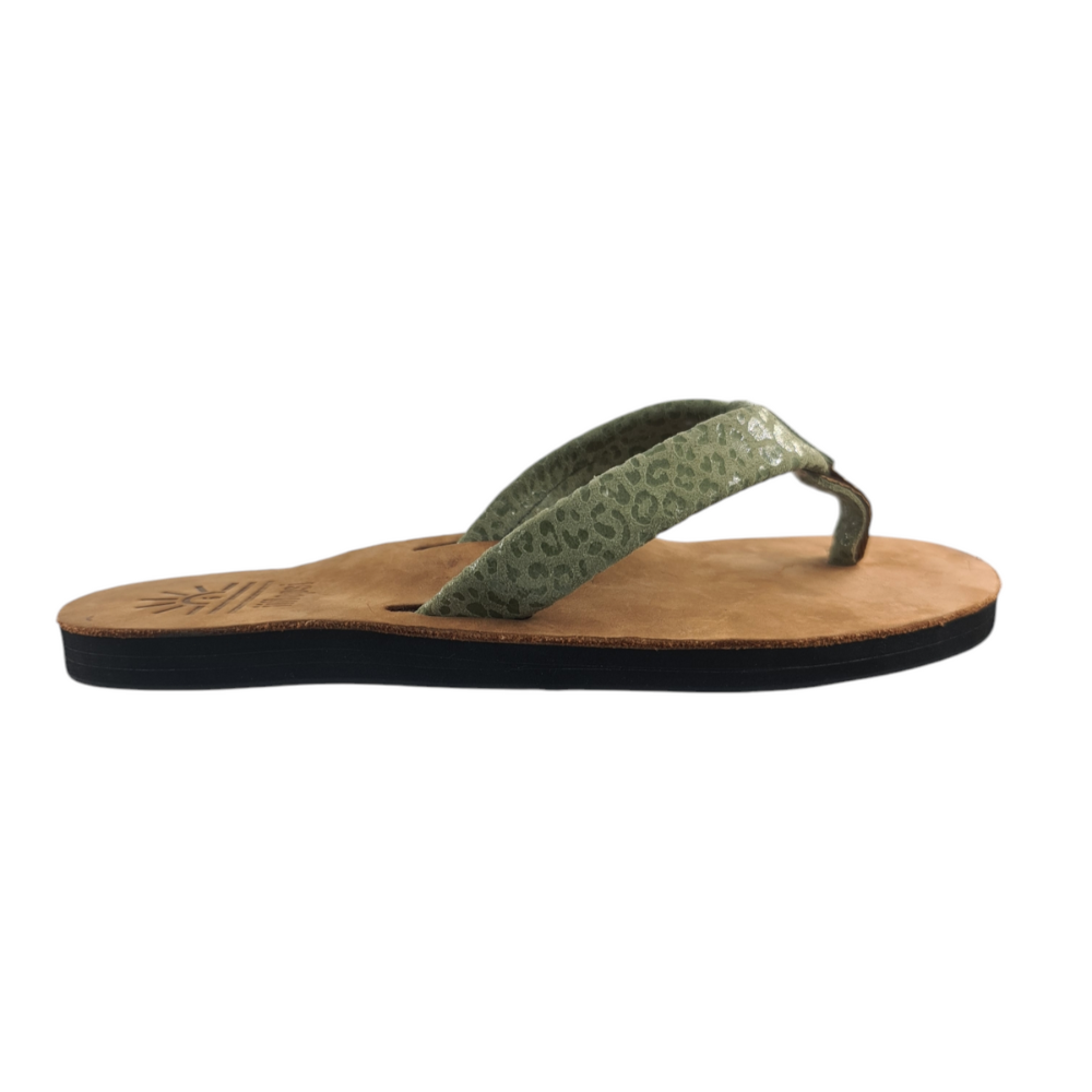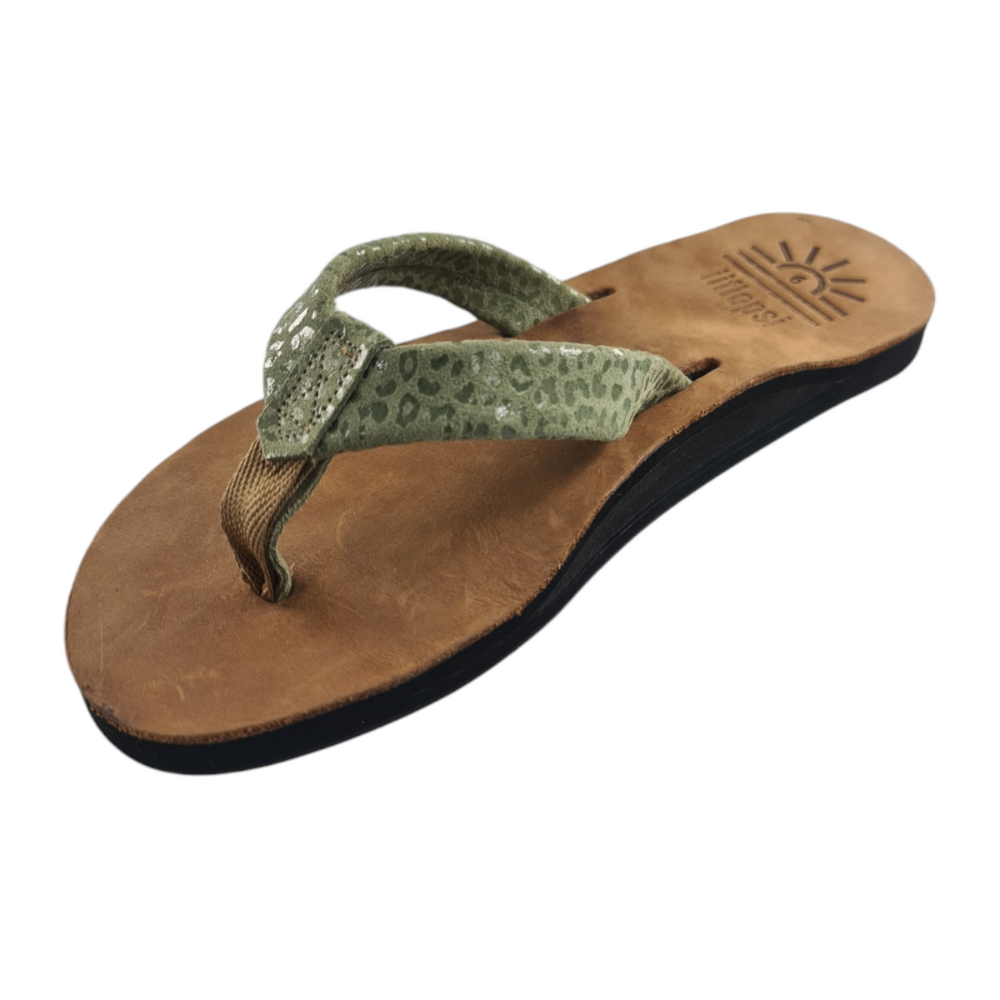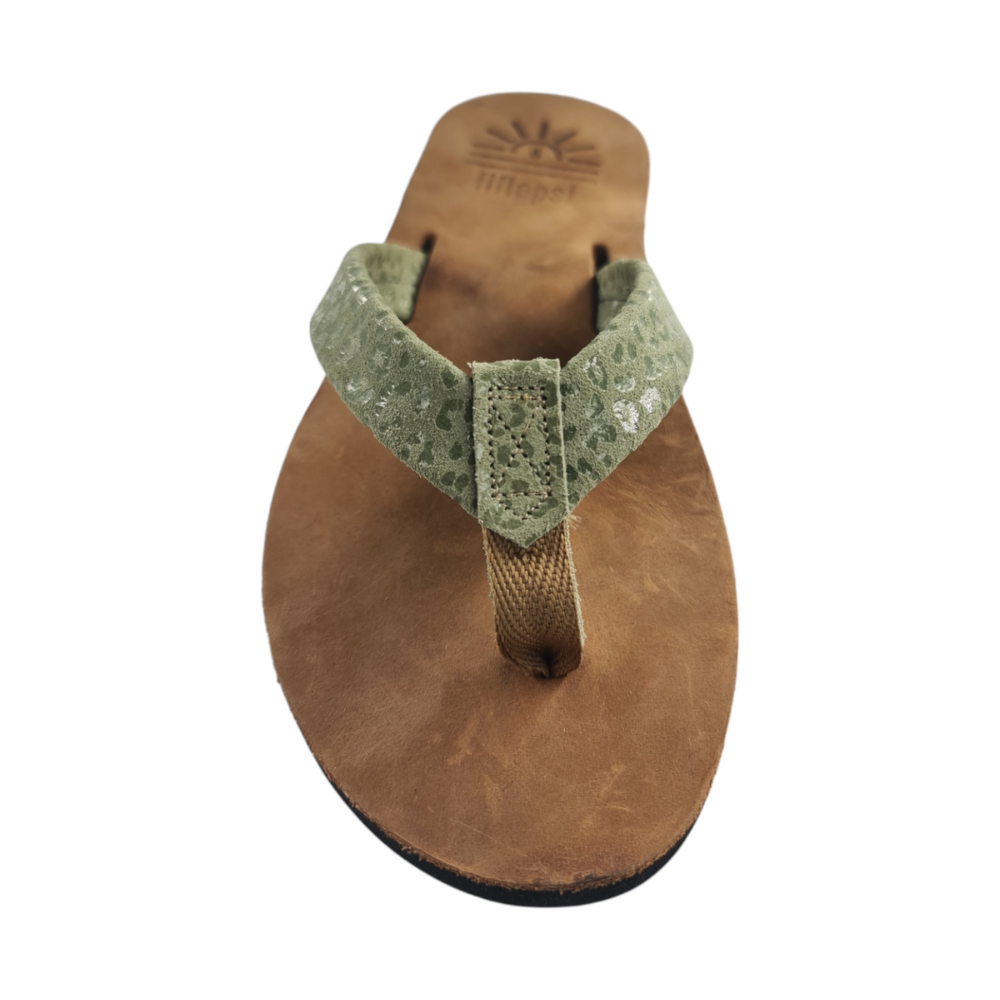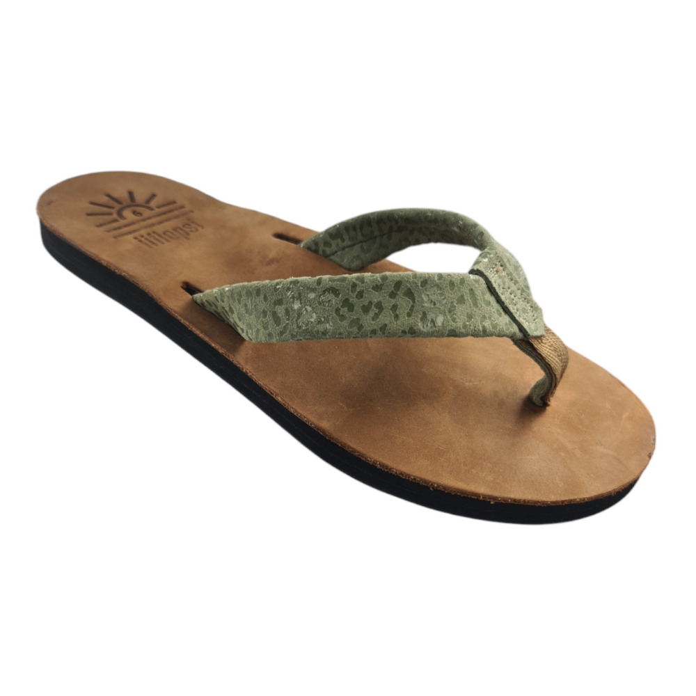 Our iiflopsi Leopard greens are a stylish and comfortable ladies flip flop for everyday wear with a uniquely selected speckled green full grain leather strap, in addition to leather uppers, and liners between your toes for added comfort. We use a specifically developed and designed webbing to allow for the perfect fit with a flod to meet leather strap for a high-end finish. Our flip flops are designed with a cushioned footbed that offers excellent arch support and comfort for all-day wear and only gets more comfortable with time as they wear in. Our flexible rubber outsole ensures reliable traction, making it perfect for a variety of surfaces, whether you're heading to the beach with friends or taking a walk in around your locally mall. With its combination of comfort, support, and sleek design, our iiflopsi ladies Leopard greens are a perfect go-to footwear for those who want both style, functionality and durability. Sourcing materials and handmaking all of our flip flops locally.