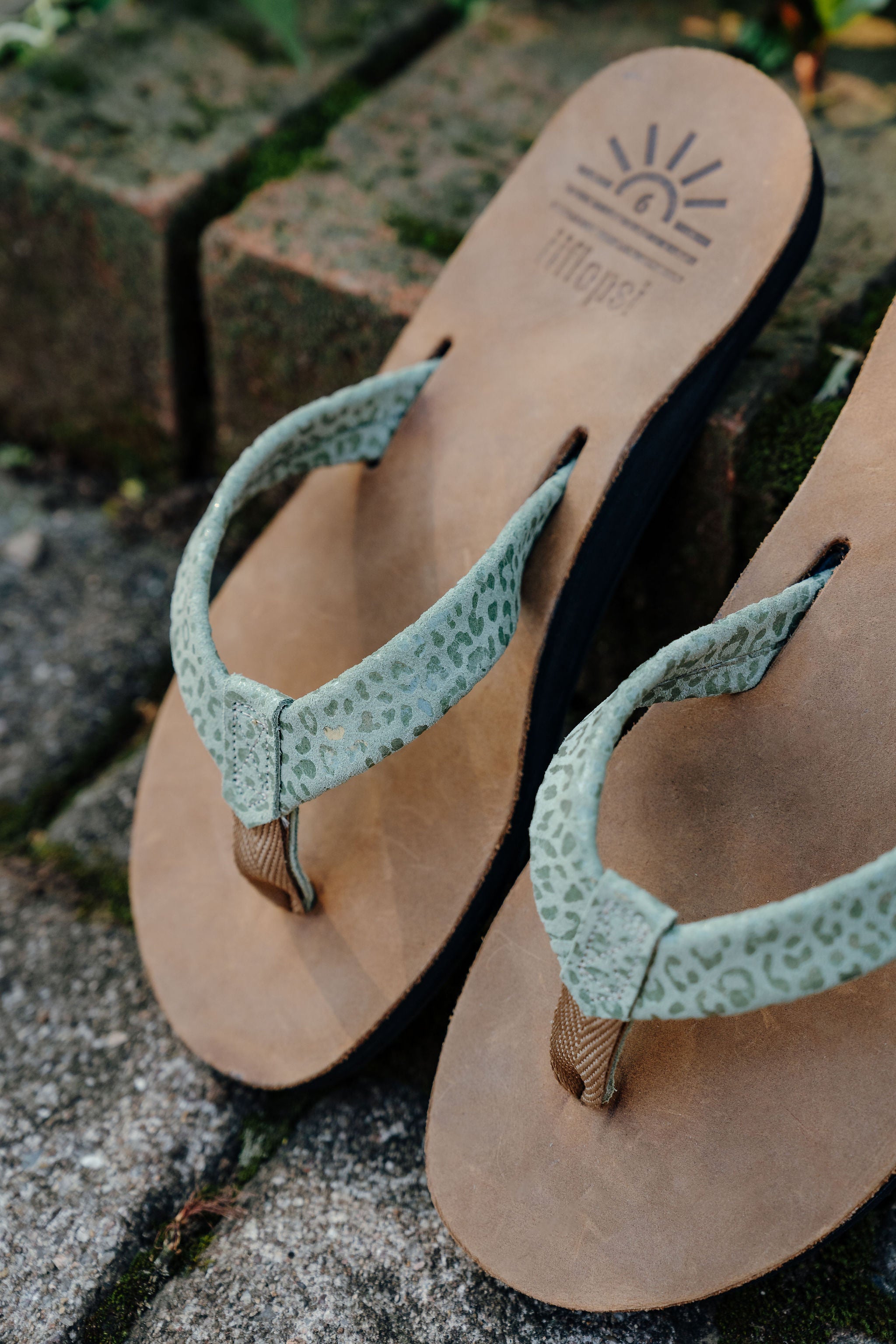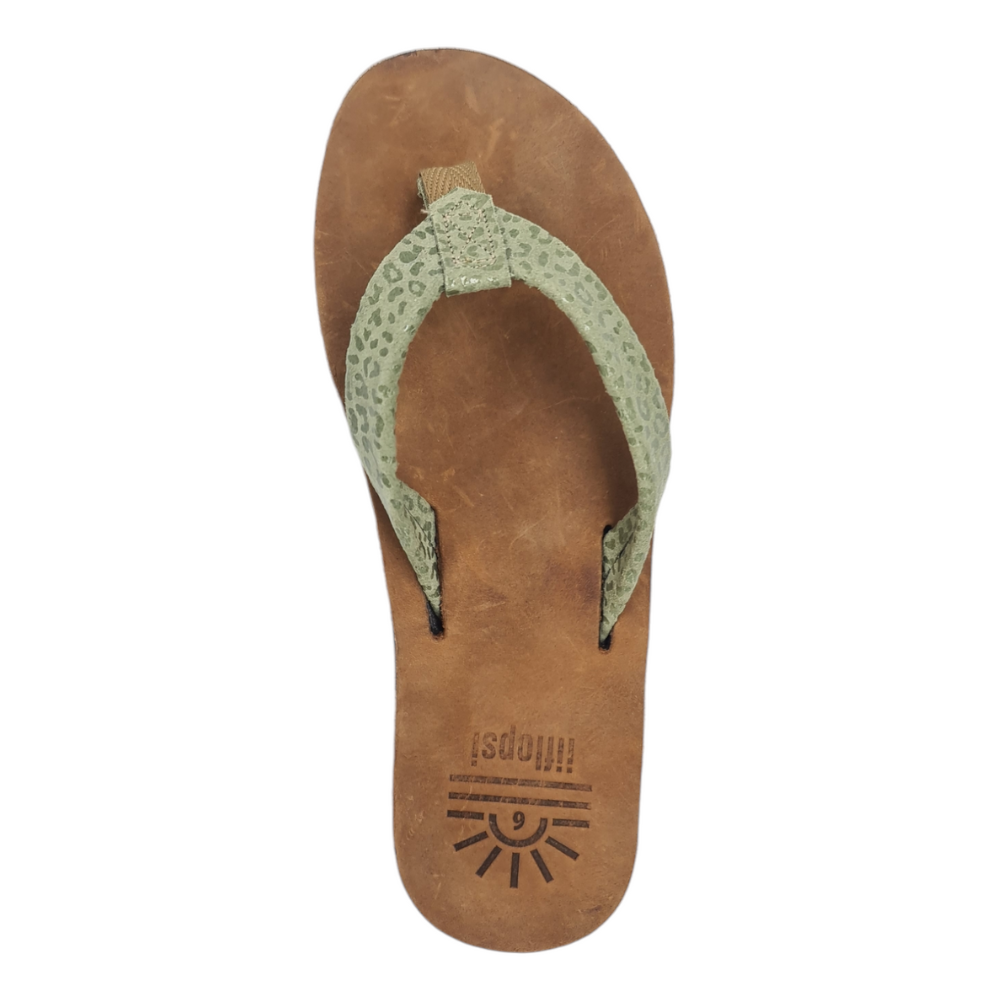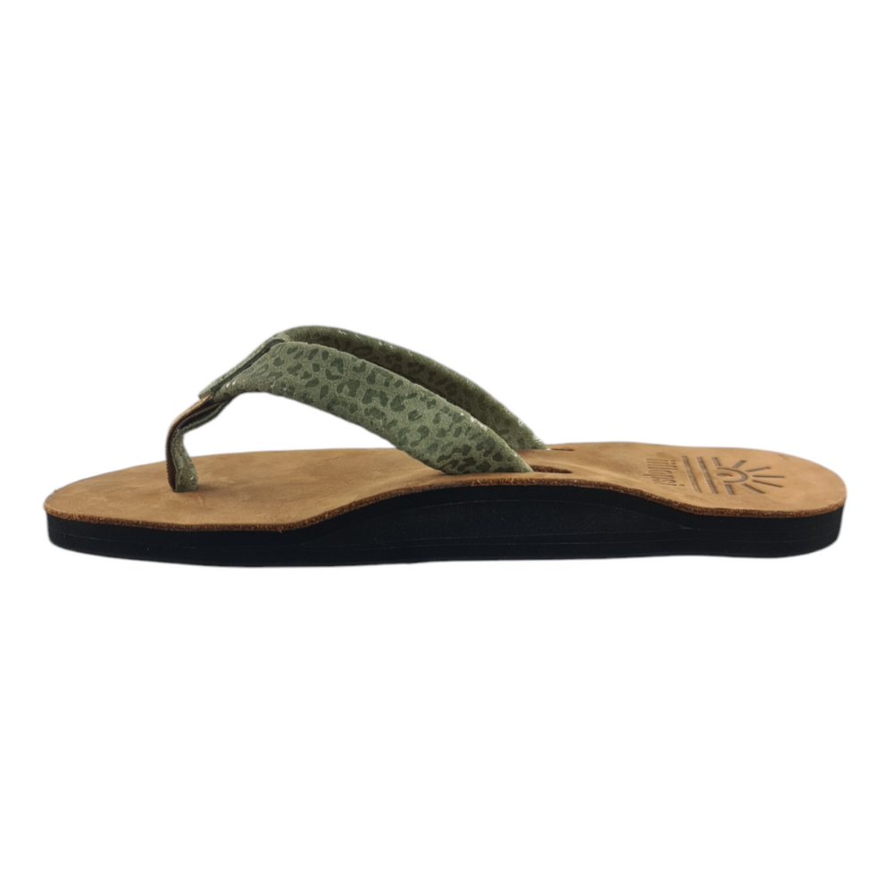 Our iiflopsi Leopard greens are a stylish and comfortable ladies flip flop for everyday wear with a uniquely selected speckled green full grain leather strap, in addition to leather uppers, and liners between your toes for added comfort. We use a specifically developed and designed webbing to allow for the perfect fit with a flod to meet leather strap for a high-end finish. Our flip flops are designed with a cushioned footbed that offers excellent arch support and comfort for all-day wear and only gets more comfortable with time as they wear in. Our flexible rubber outsole ensures reliable traction, making it perfect for a variety of surfaces, whether you're heading to the beach with friends or taking a walk in around your locally mall. With its combination of comfort, support, and sleek design, our iiflopsi ladies Leopard greens are a perfect go-to footwear for those who want both style, functionality and durability. Sourcing materials and handmaking all of our flip flops locally.
