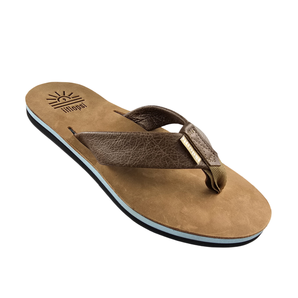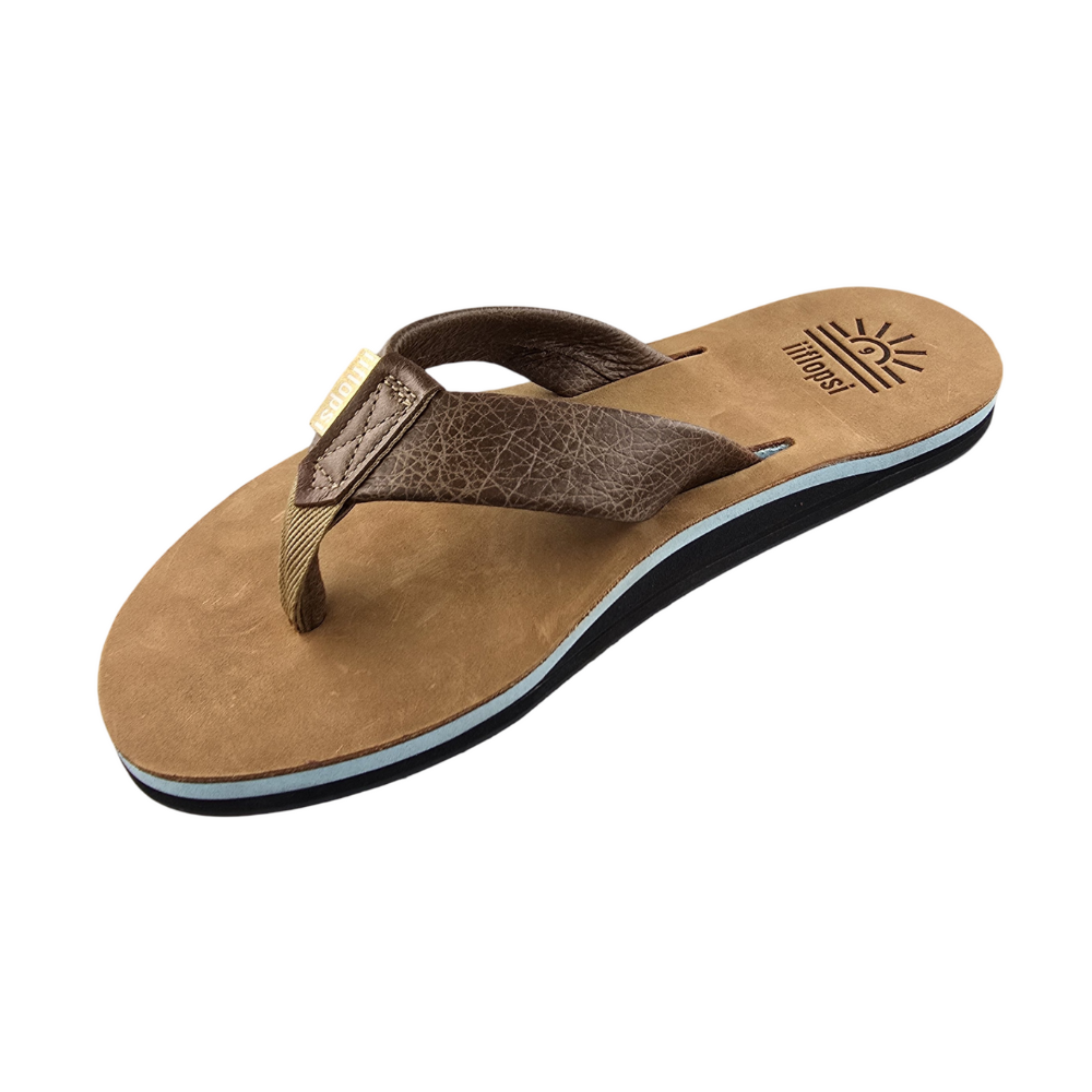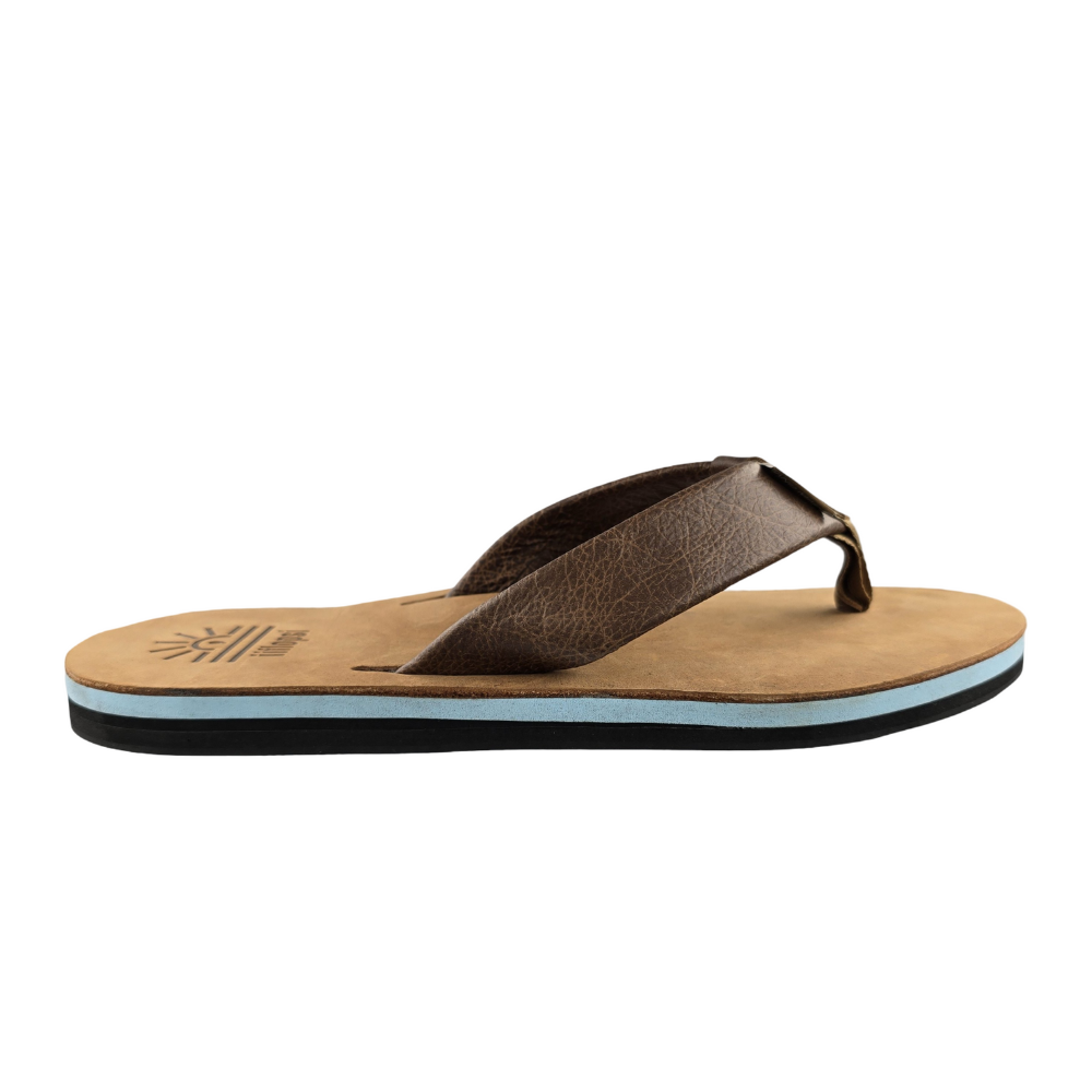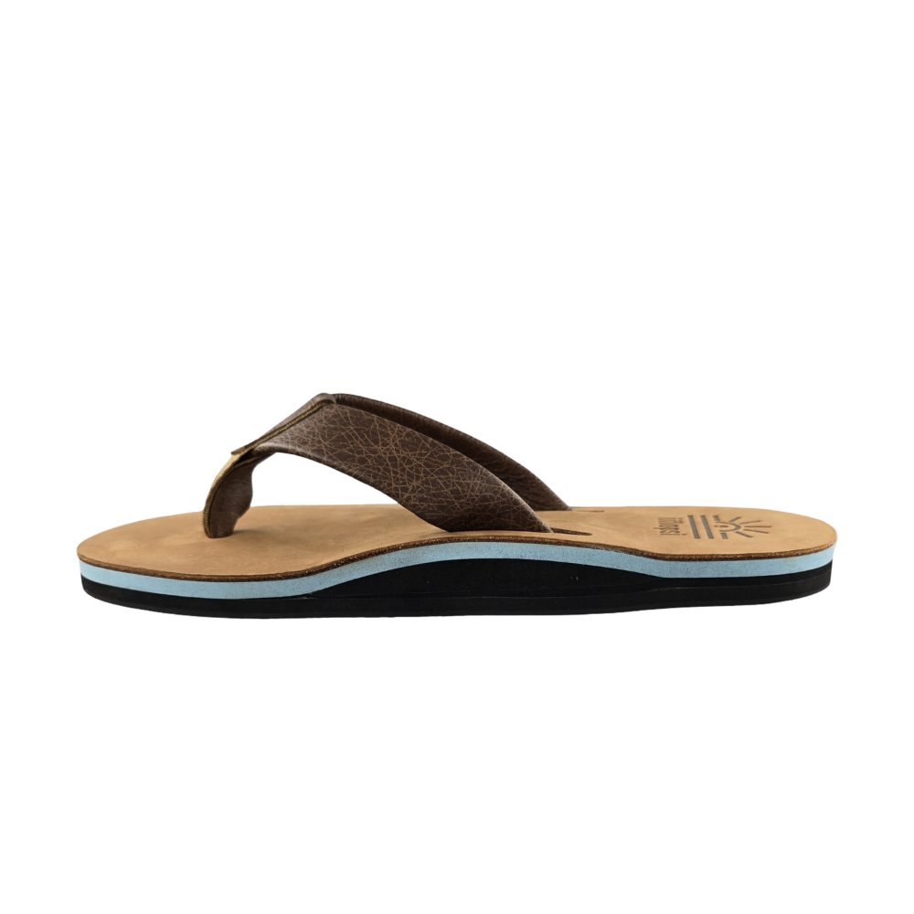 Full grain Tan leather Upper and strap with baby blue mid sole, arch support, cream insert and black rubber sole. This is a casual, fun in the sun flip flop.