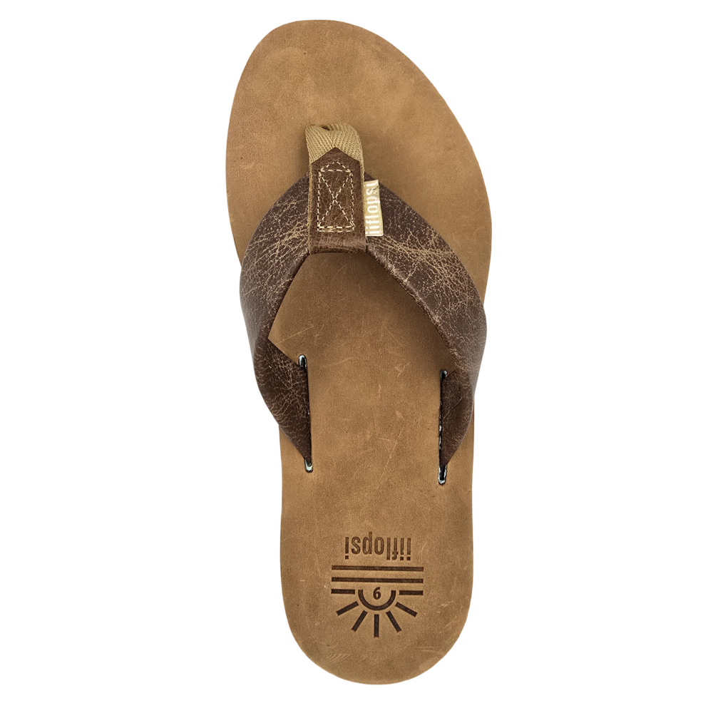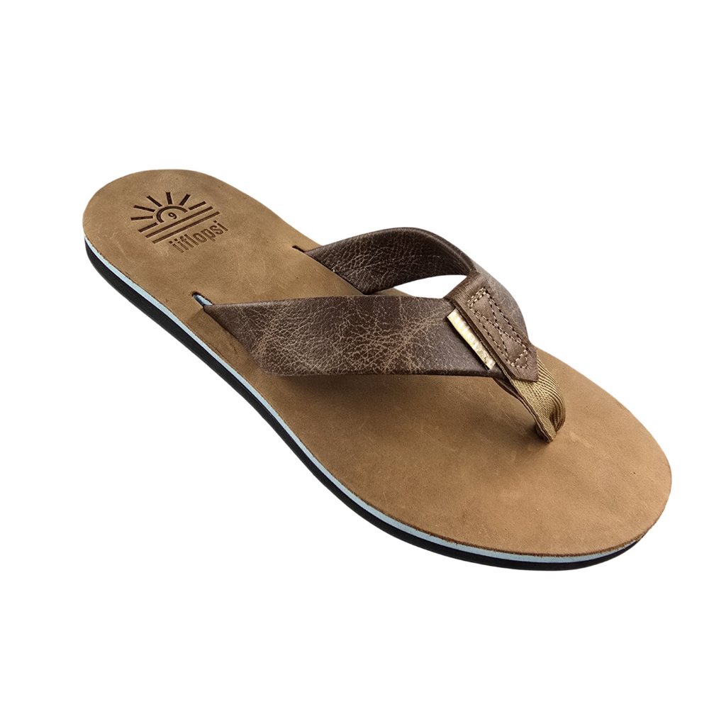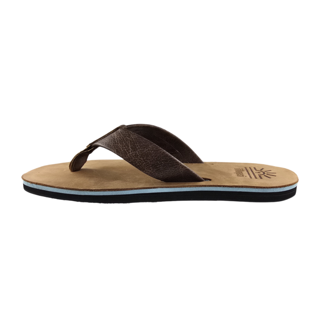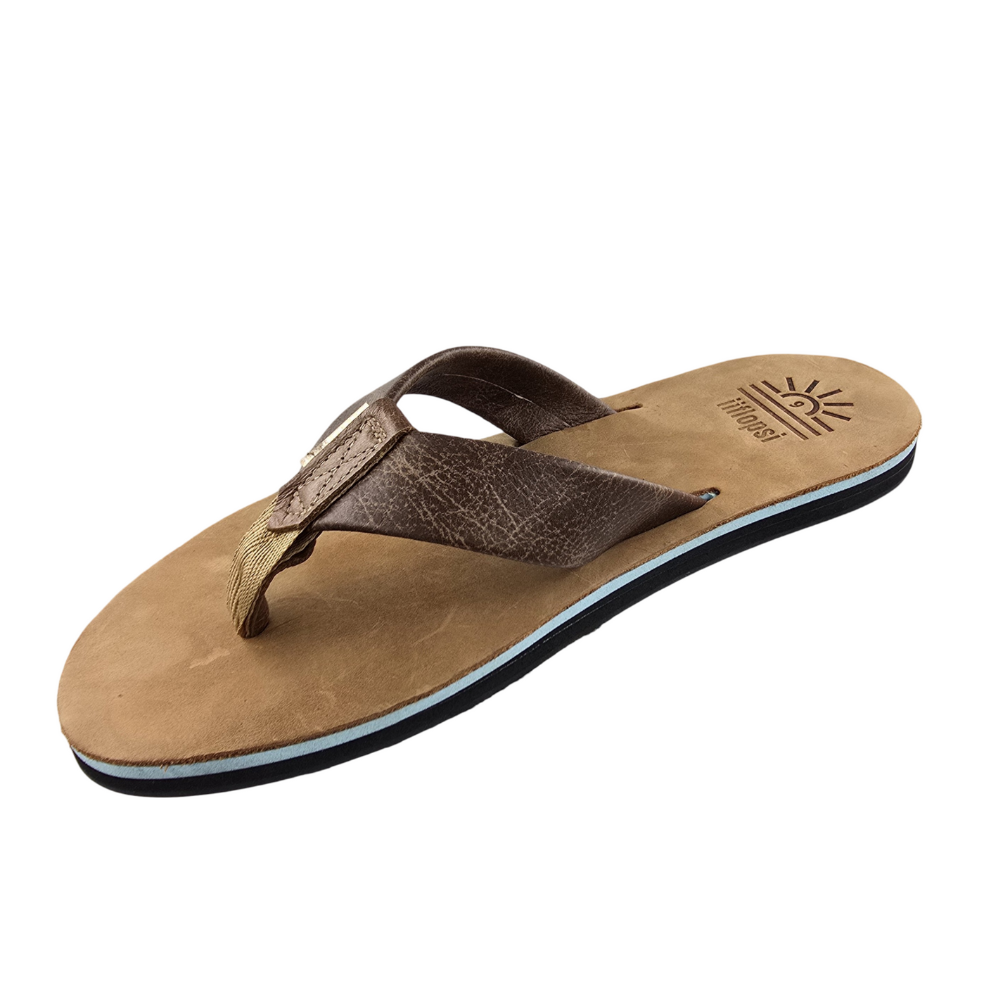 Full grain Tan leather Upper and strap with baby blue mid sole, cream insert and black rubber sole. This is a casual, fun in the sun flip flop.
