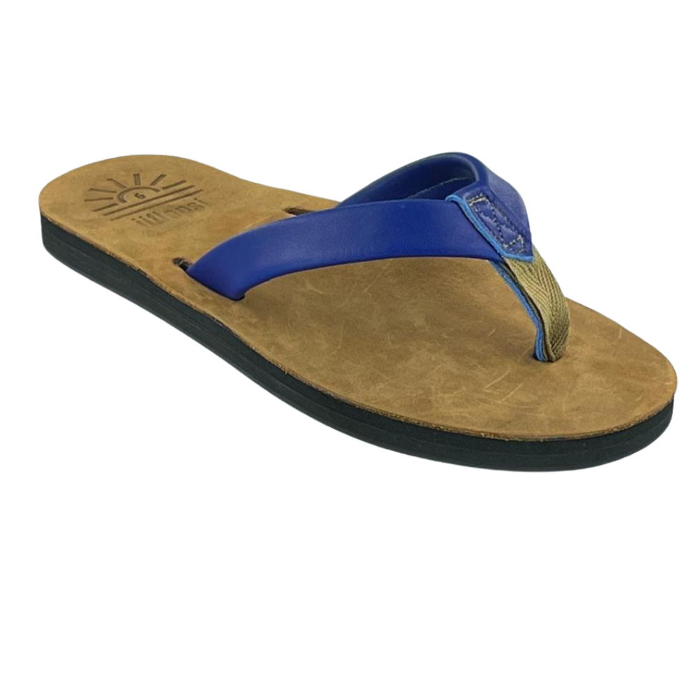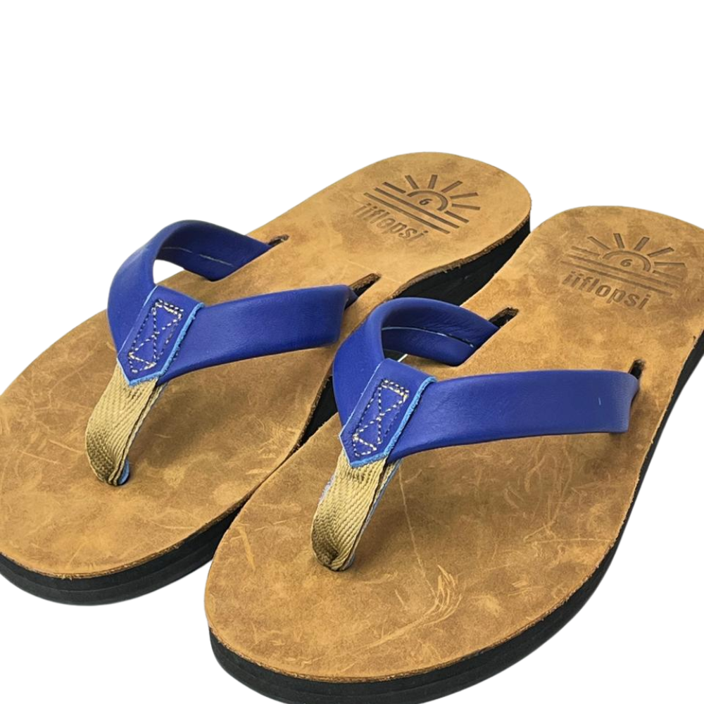 Our iiflopsi Royal's are a stylish and comfortable ladies flip flop for everyday wear with a Royal blue Leather strap to brighten things up a little. A classic tan, brown. Featuring carefully selected leather uppers, and liners between your toes for additional comfort. Our flip flops are designed with a cushioned footbed that offers excellent arch support and comfort for all-day wear. Our flexible rubber outsole ensures reliable traction, making it perfect for a variety of surfaces, whether you're heading to the beach with friends or taking a walk in your local park. With its combination of comfort, support, and sleek design, our iiflopsi ladies Royal's are a perfect go-to footwear for those who want both style, functionality and durability. Sourcing materials and handmaking all of our flip flops locally.