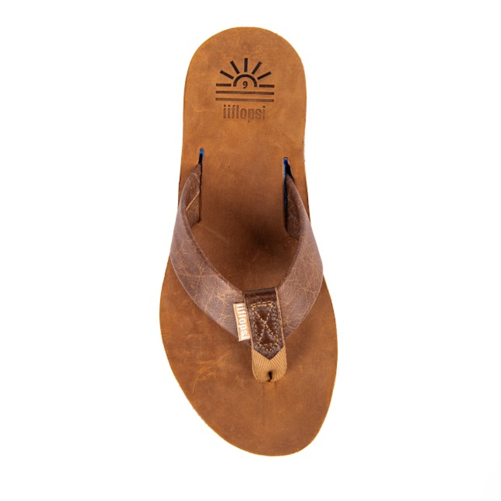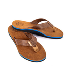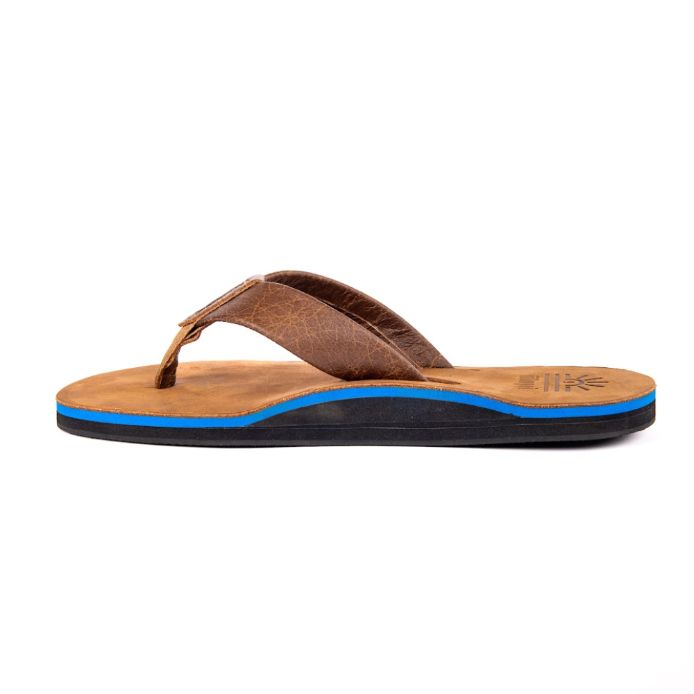 Full grain Castrol Tan leather Upper and strap with a Cobalt blue inlay, arch support, black insert and black memory foam.