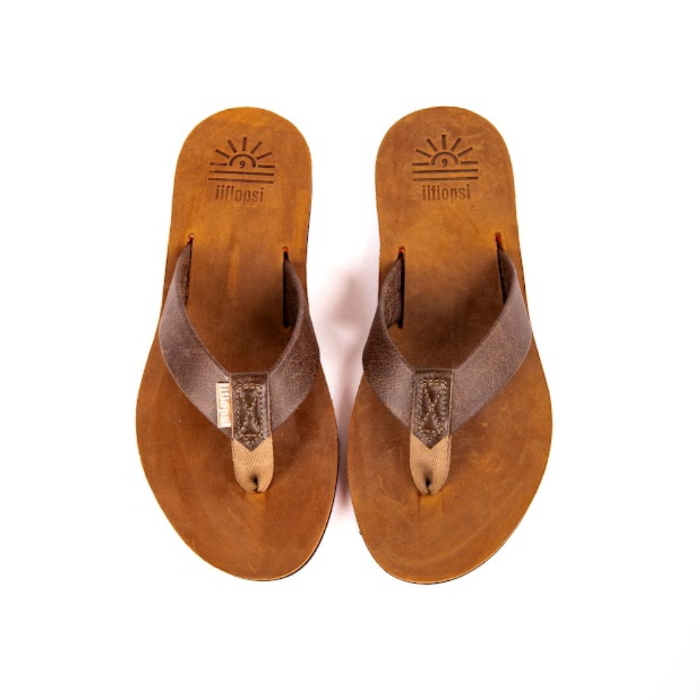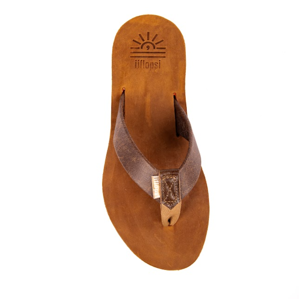 Our Full grain Castrol Tan leather Upper offers a soft touch with a walnut strap, Orange mid sole with a black rubber sole. This flip flop was designed as a fun all-rounder. It has no arch support.