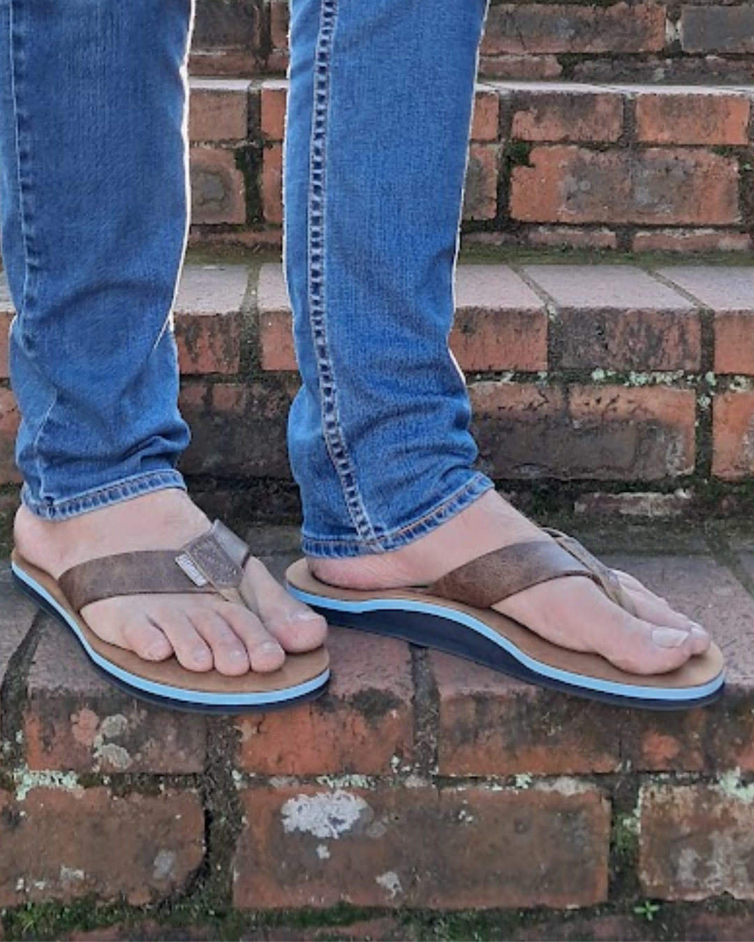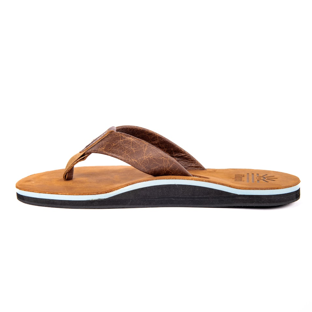 Full grain Tan leather Upper and strap with baby blue mid sole, arch support, cream insert and black rubber sole. This is a casual, fun in the sun flip flop.